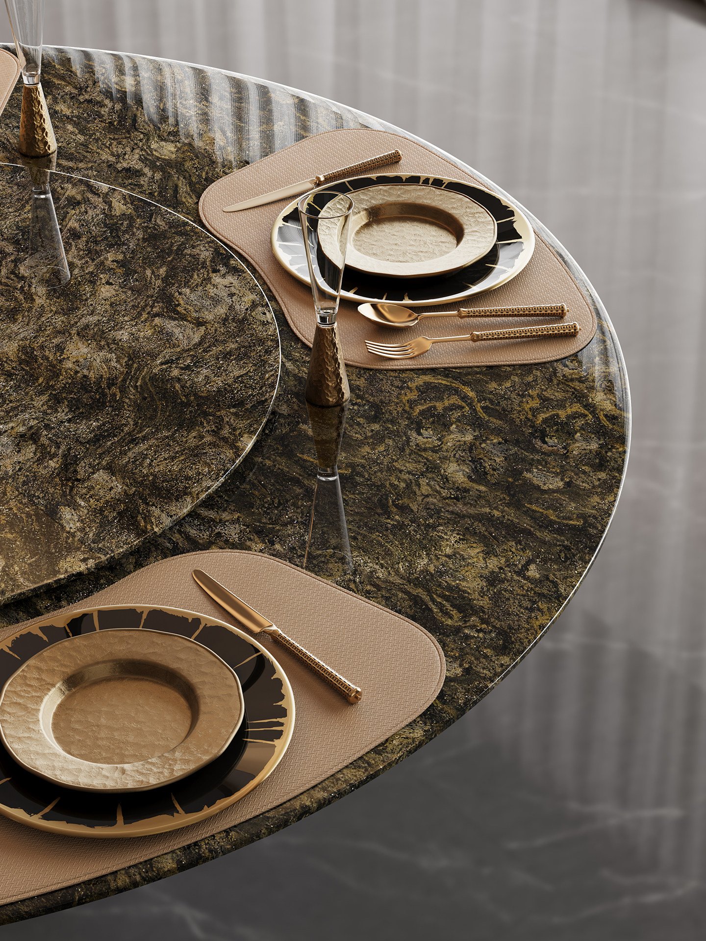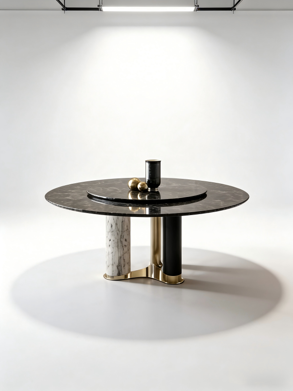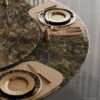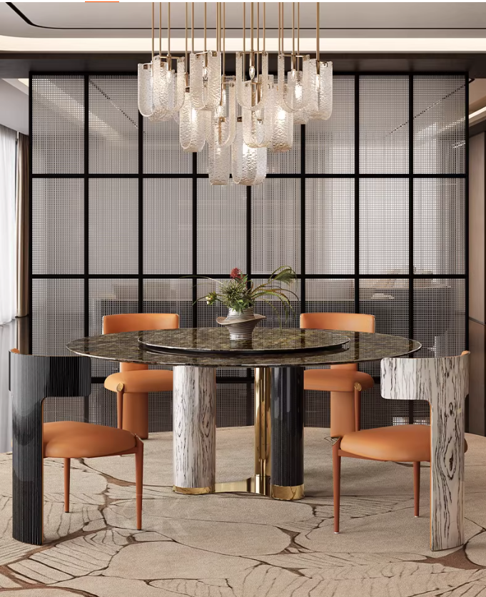 Dimensions: 1.3-meter dining table: 1350*1350*780mm, turntable: 800*800mm; 1.5-meter dining table: 1500*1500*780mm, turntable: 900*900mm. Table material: Platinum Diamond Natural Luxury Stone + Black Ripple Wood veneer + Ice Birch Wood veneer + Titanium Stainless Steel + Chinese Elm Solid Wood. Production cycle: In-stock items shipped within 7-10 days; custom orders take 35-45 days depending on quantity. Please confirm exact timeline with customer service. Note: Due to manufacturing specifics, each piece may have 3-5cm dimensional variation. This image is for reference only. Actual product may differ. Production cycle: In-stock items shipped within 7-10 days; custom orders take 35-45 days depending on quantity. Please confirm exact timeline with customer service.