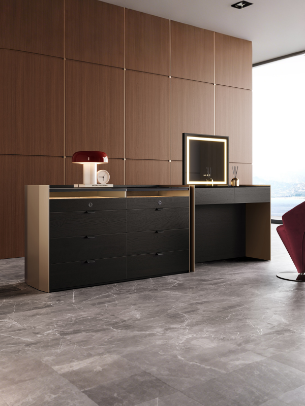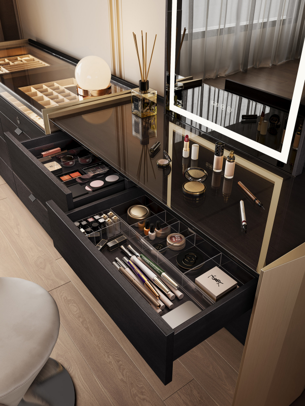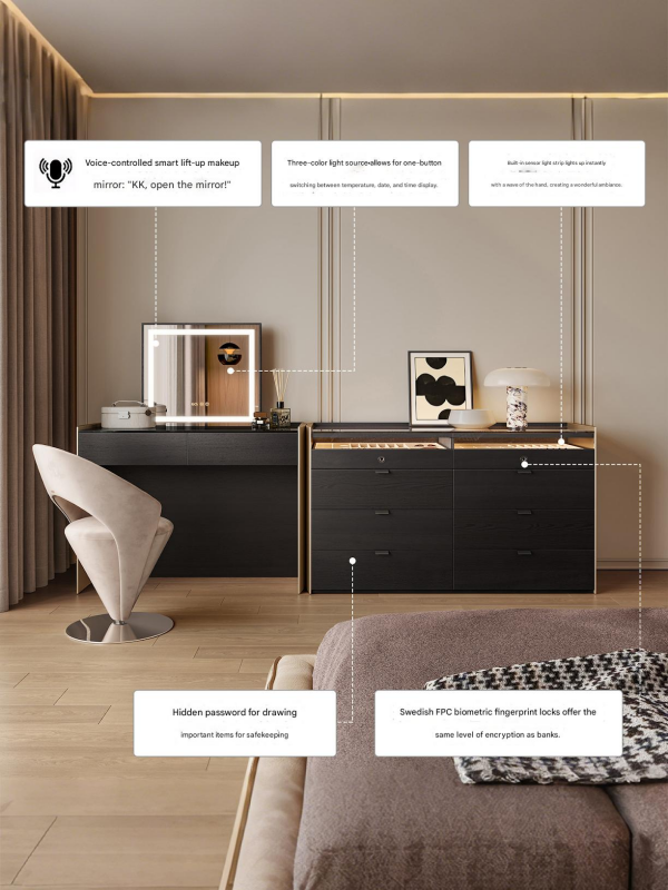 Features: Smart Lift-up Dressing Mirror + Ambient Lighting + Concealed Combination Drawer + Fingerprint Lock
